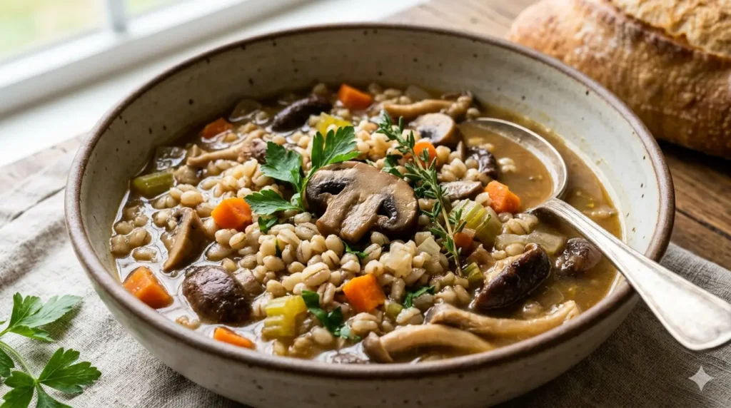 A mushroom barley stew with carrots, thyme, and a deep broth, made for cool days when you want comfort without a heavy sauce.